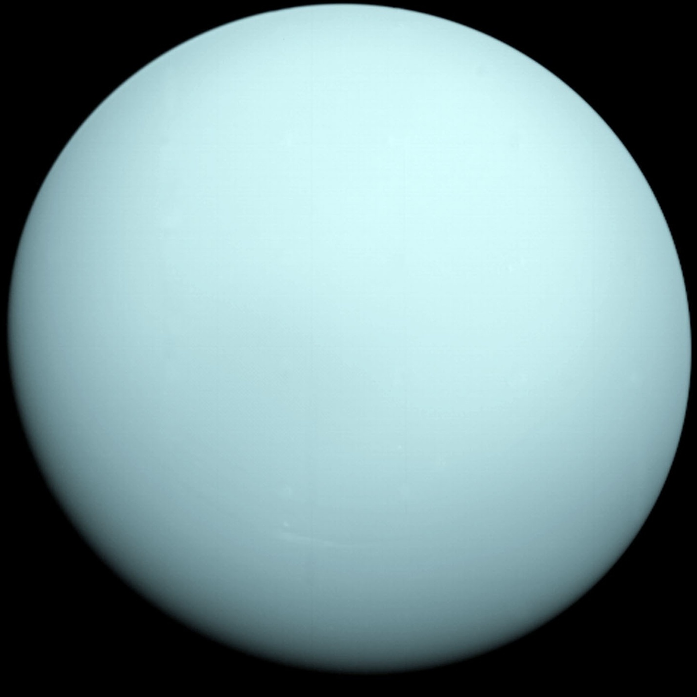 Uranus (19.2 AU), at 14 Earth masses, is the lightest of the outer planets. Uniquely among the planets, it orbits the Sun on its side; its axial tilt is over ninety degrees to the ecliptic. It has a much colder core than the other giant planets and radiates very little heat into space. Uranus has 27 known satellites, the largest ones being Titania, Oberon, Umbriel, Ariel, and Miranda.